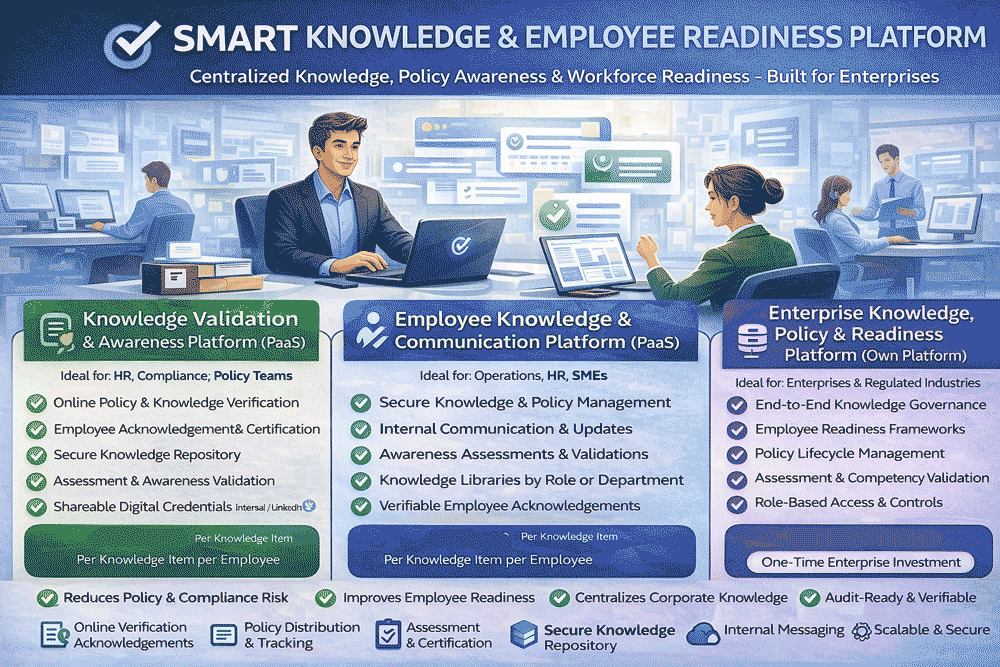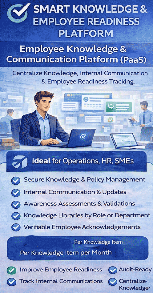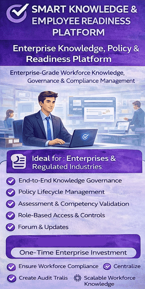 The Smart Knowledge & Employee Readiness Platform is designed to help enterprises, SMEs, and service providers ensure that employees receive, understand, acknowledge, and comply with organizational policies, procedures, and operational knowledge.